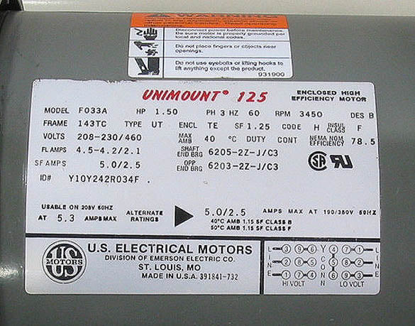 Has a U.S. Electrical Motors, Unimount 125 Model F033A, 1.5 HP,